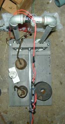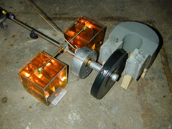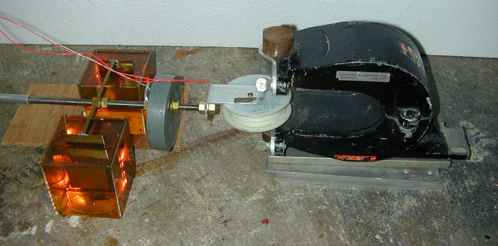 A 14,000 turn coil is positioned within the gap of a war-surplus magnet. The weight is made of five pounds of lead. Dampening is accomplished by two brass paddles immersed in the two containers power steering fluid. As can be seen in the photo, the coil is not centered but is off-set within the gap of the magnet. I have discovered that the seismograph sensor is much more sensitive when the coil is not centered. Click on the picture for a much larger image.