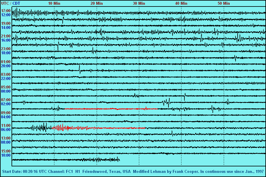 This near-real-time recording was made with my oldest Lehman horizontal seismograph FC1 (set up in my garage) and Larry Cochrane's WinSDR datalogger software and hardware. I constructed this sensor in January of 1997 and it has been in continuous operation since then. This sensor is capable of detecting any strong earthquake on earth. It is most sensitive to long seismic waves. If you see an earthquake recorded on the helicorder, mouse click on Current Quakes World Wide to see where the quake occurred. Current Quakes World Wide To see other PSN helicorders mouse click on Near Live PSN Helicorders