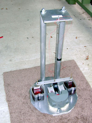 The powerful magnet is from a very old chart recorder. The gap of the magnet can easily be changed with the two hands. The damping medium is power steering fluid. The double damping paddles are made of brass. The five pound lead pendulum weight was originally poured in a tuna can. There are 17,200 turns of wire in the coil. The coil is wound in such a way that all of the turns of the coil are within the gap of the magnet. I have not seen this vertical orientation of coil within the gap of a magnet in any other amateur seismic detector. Click on the picture for a much larger image.